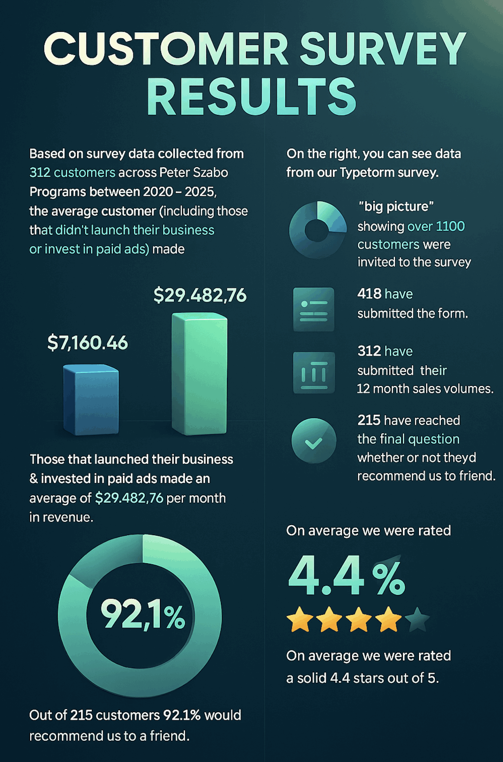 Based on survey data collected from 312 customers across Peter Szabo Programs between 2020 – 2025, the average customer (including those that didn't launch their business or invest in paid ads) made $7,160.46 per month in revenue.