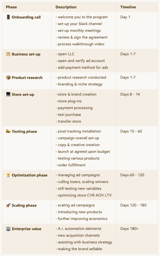 This isn't your typical partnership program. While most rely on overcrowded group coaching calls where dozens compete to get a question answered, we provide direct 1:1 mentorship with a dedicated expert. On top of that, you're not just getting access to our internal team's training and SOPs – we actively deploy the same strategies that have generated tens of millions in revenue for our clients. These aren’t untested theories or cookie-cutter templates. They're real-world systems refined across hundreds of stores, implemented with you and for you – dramatically increasing your odds of success.