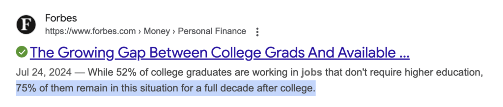 Here's another crazy statistic – imagine spending $100K+ and 4 years of your life to get a degree that 3/4 people won't even be able to take advantage of.